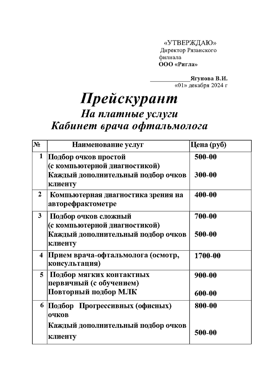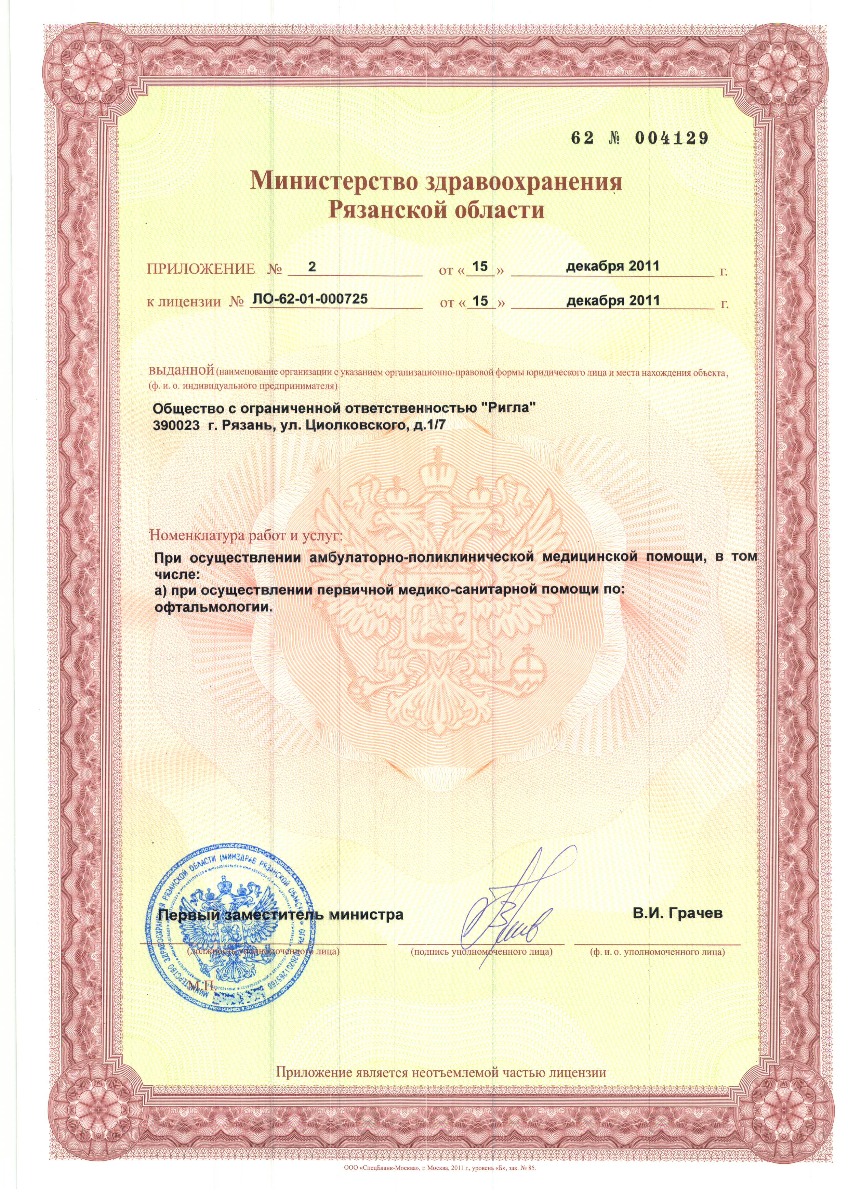 Лицензия № ЛО-62-01-000725 от 15.12.11 года, выданную Министерством здравоохранения Рязанской области (390006, г. Рязань, ул. Свободы, д. 32; тел: (4912) 270771) на осуществление амбулаторно-поликлинической медицинской помощи, в том числе: при осуществлении первичной медико-санитарной помощи по офтальмологии (см. вложение);